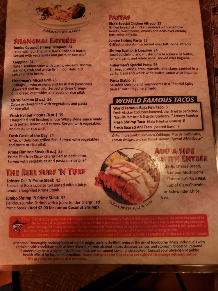 Restaurant menu, map for shanghai reds bar & grill located in 92262, palm springs ca, 235 s indian canyon dr. These baja fish tacos are cocooned in a warm corn tortilla garnished with crunchy cabbage, fresh pico de gallo, and creamy white sauce all finished with tangy lime. Fold tortilla over and enjoy! In a medium bowl, mix together the flour, chili powder and 1 1/2 teaspoons each of kosher salt and. Place the flour, egg white and bread crumbs in separate shallow bowls.